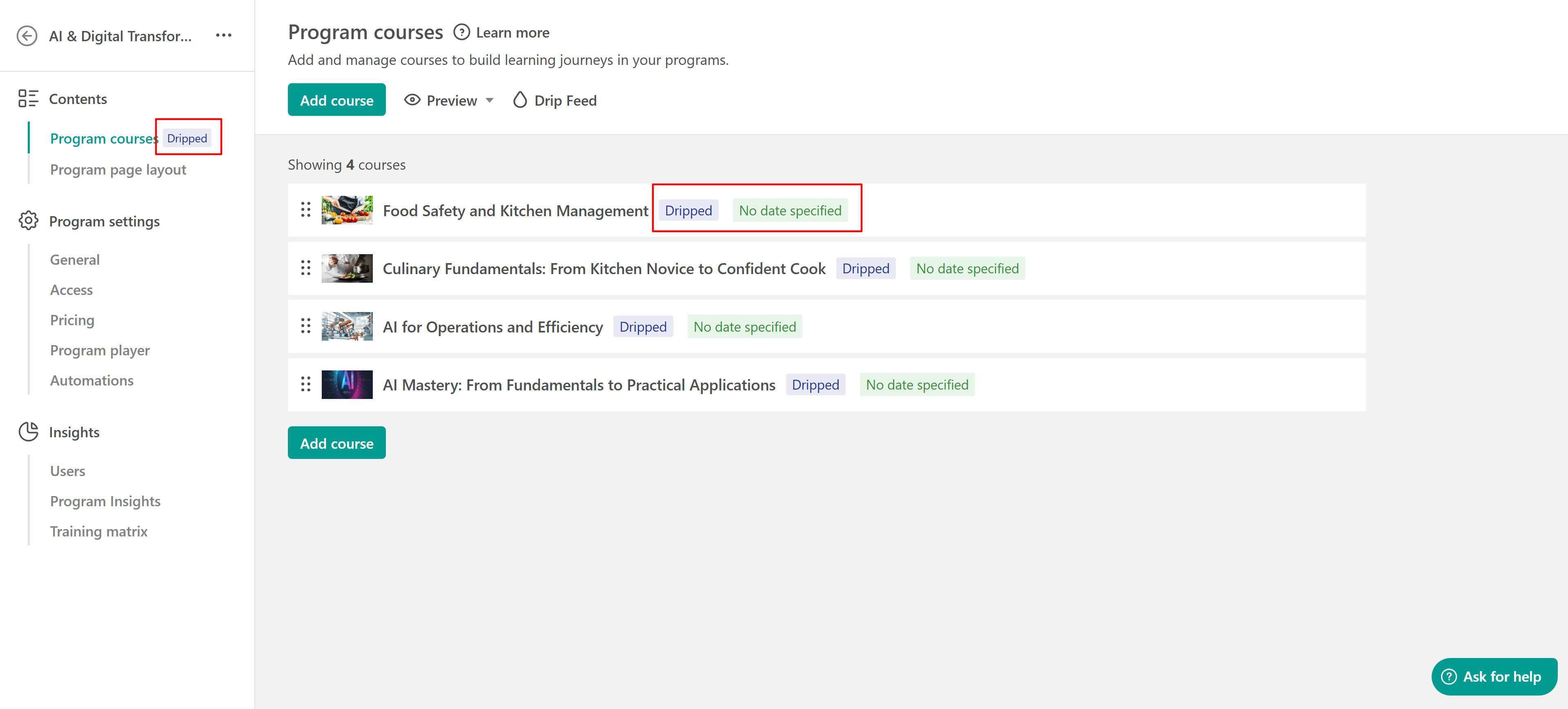 - If a course is part of multiple learning programs using drip feed, the user will only be able to access the course in the program where it is unlocked. It will remain locked in other programs until the scheduled unlock time.