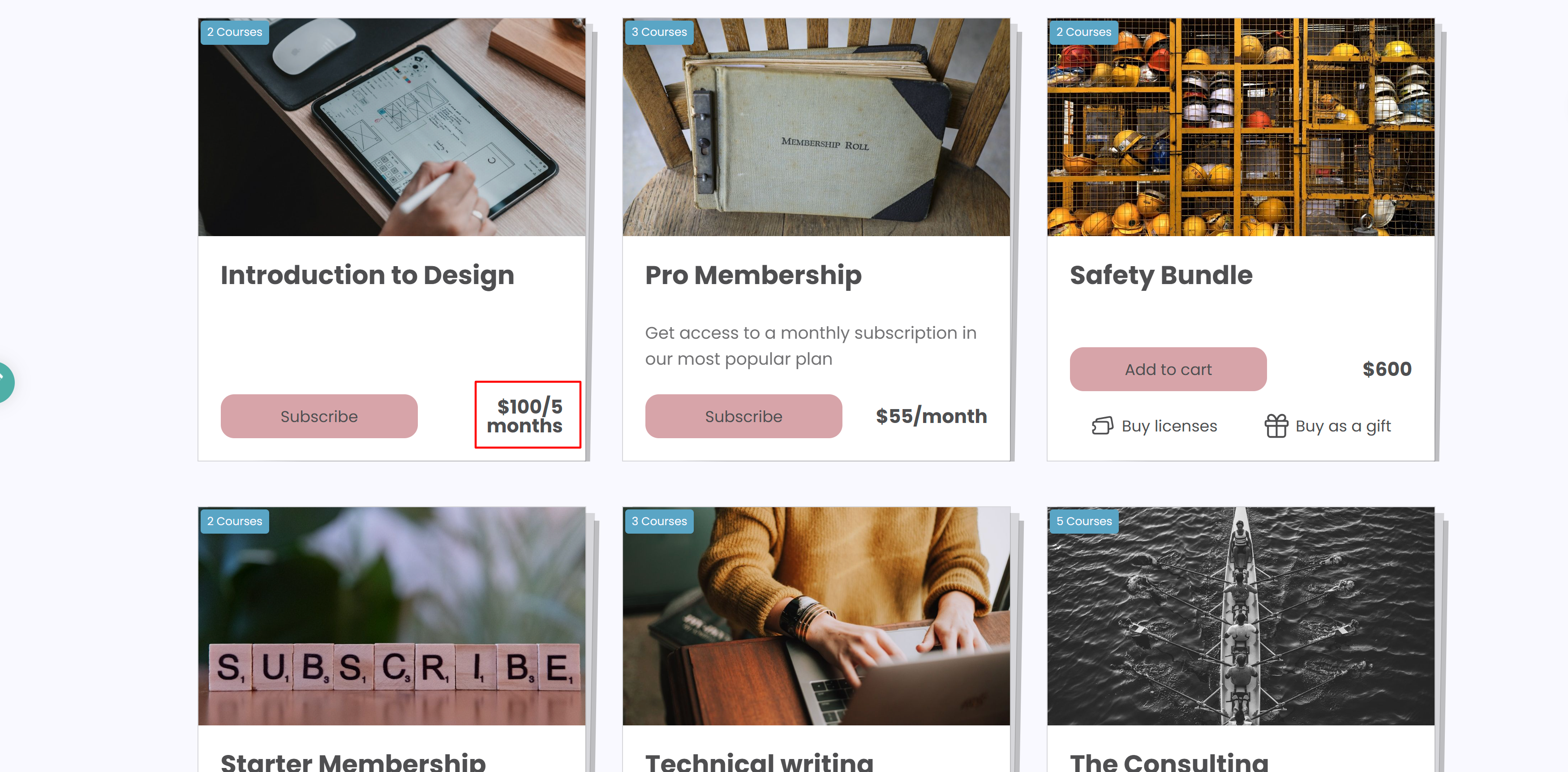 • All-access subscription: Package your entire course library into a single course-collection learning program and sell access through tiered subscriptions.