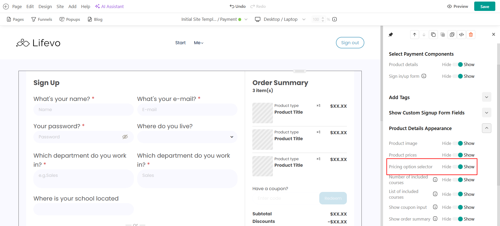 - Make sure the pricing option selector is enabled on the payment page or any payment section you’re using) so users can view all available payment options.