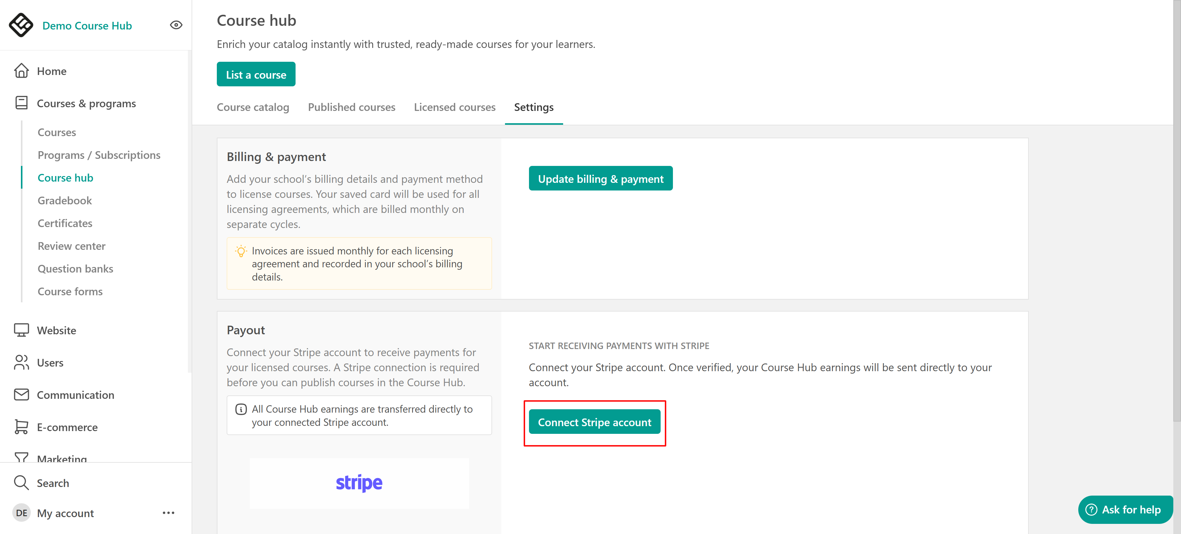 - Stripe is required before submitting a course for review and publishing it. However, you can still create Course Hub listings and save them as draft without connecting Stripe.