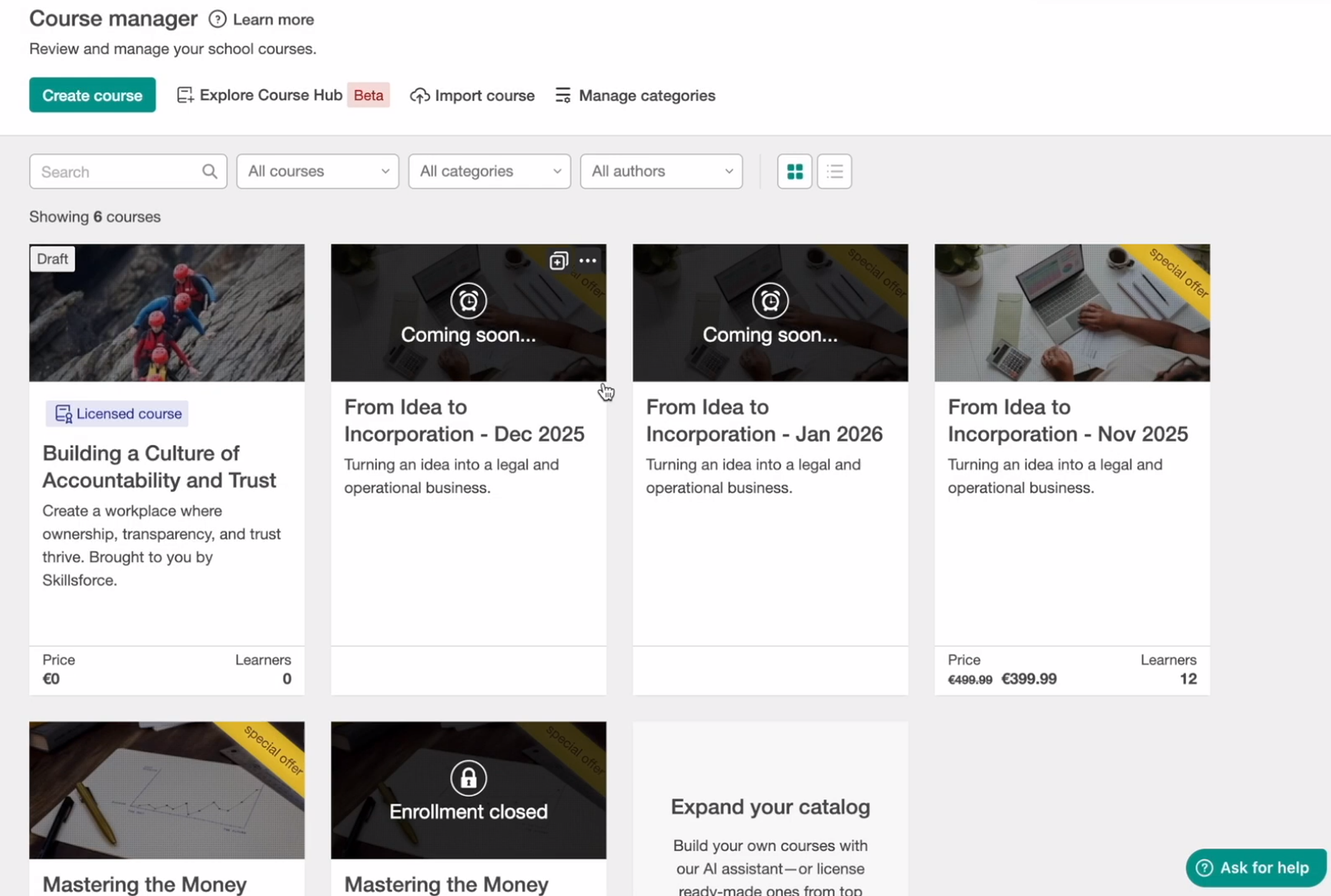 The LearnWorlds Course Hub allows you to license ready-made courses from verified creators and offer them directly inside your own LearnWorlds school.
