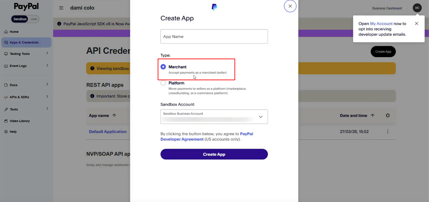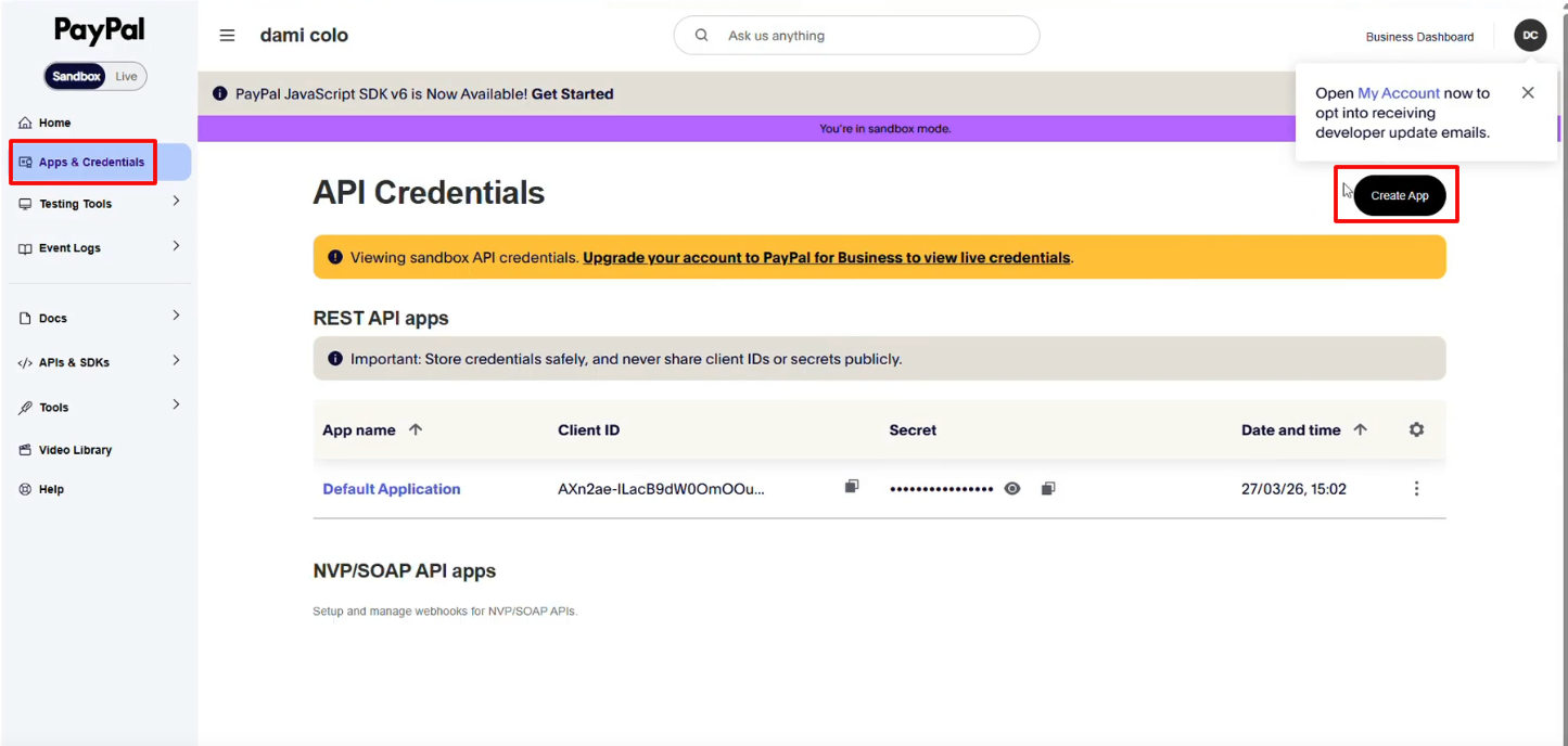 2. A new tab will open in PayPal. Under Apps & Credentials click and create a new app.