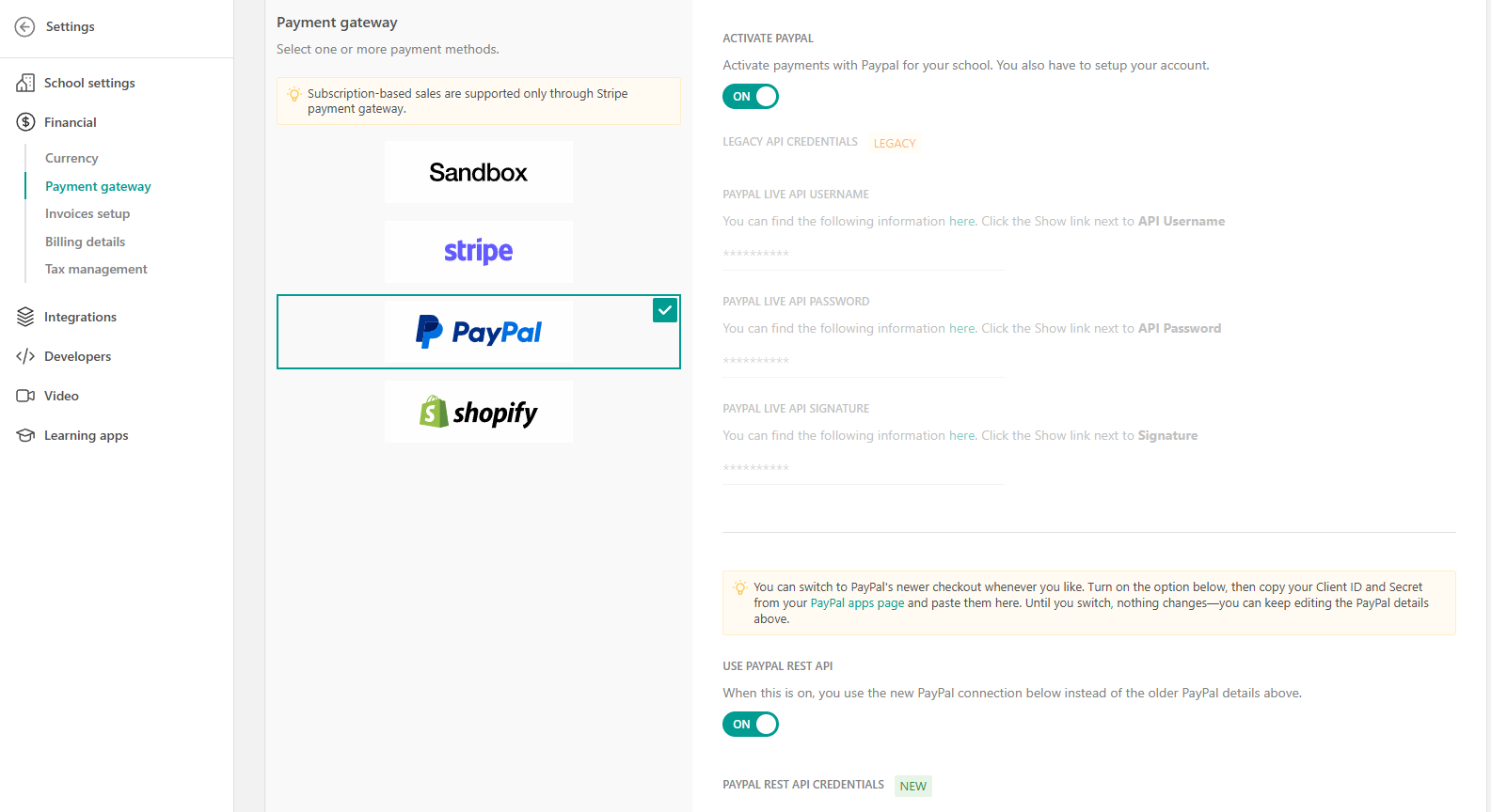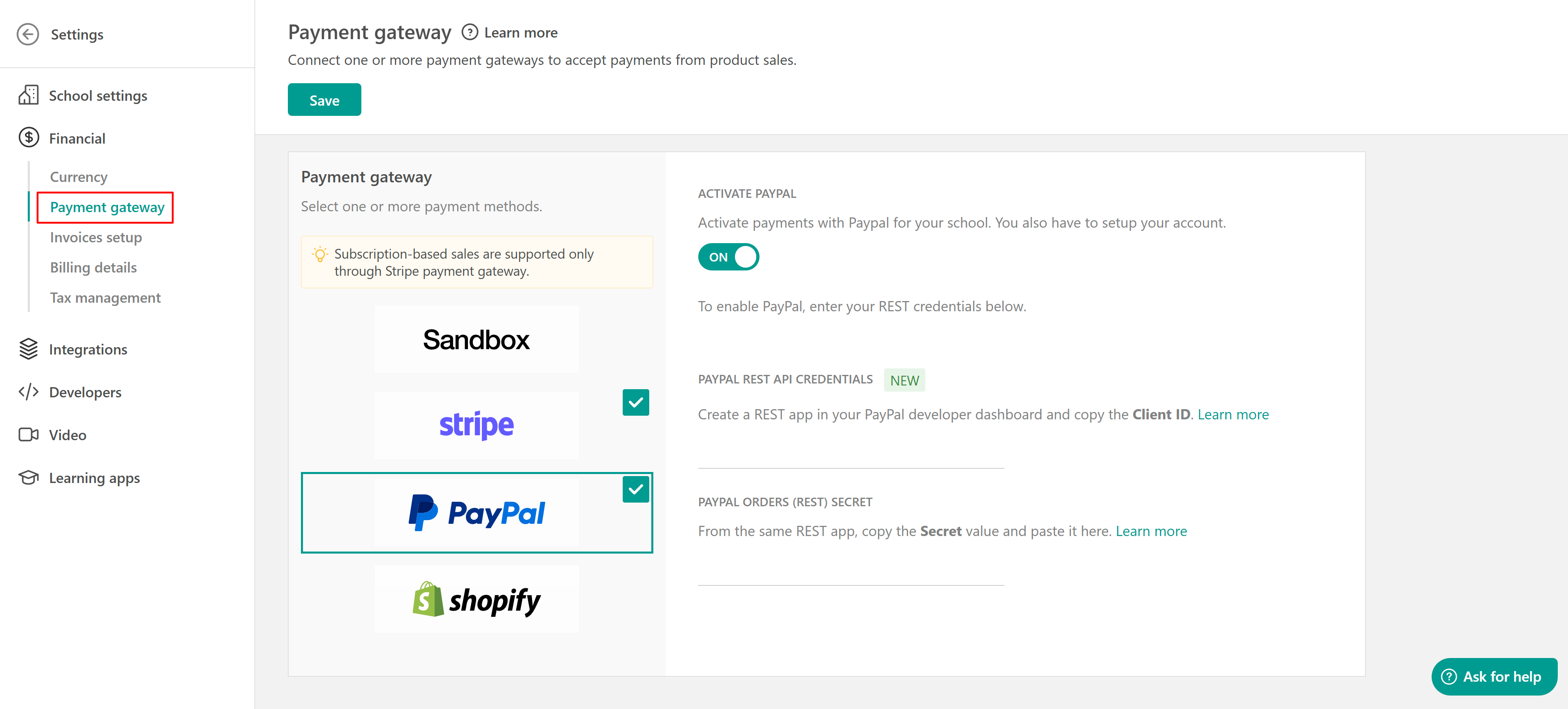 Go to Settings → Financial → Payment Gateway and choose the PayPal option. Paste the PayPal Client ID and Secret in the respective LearnWorlds fields.