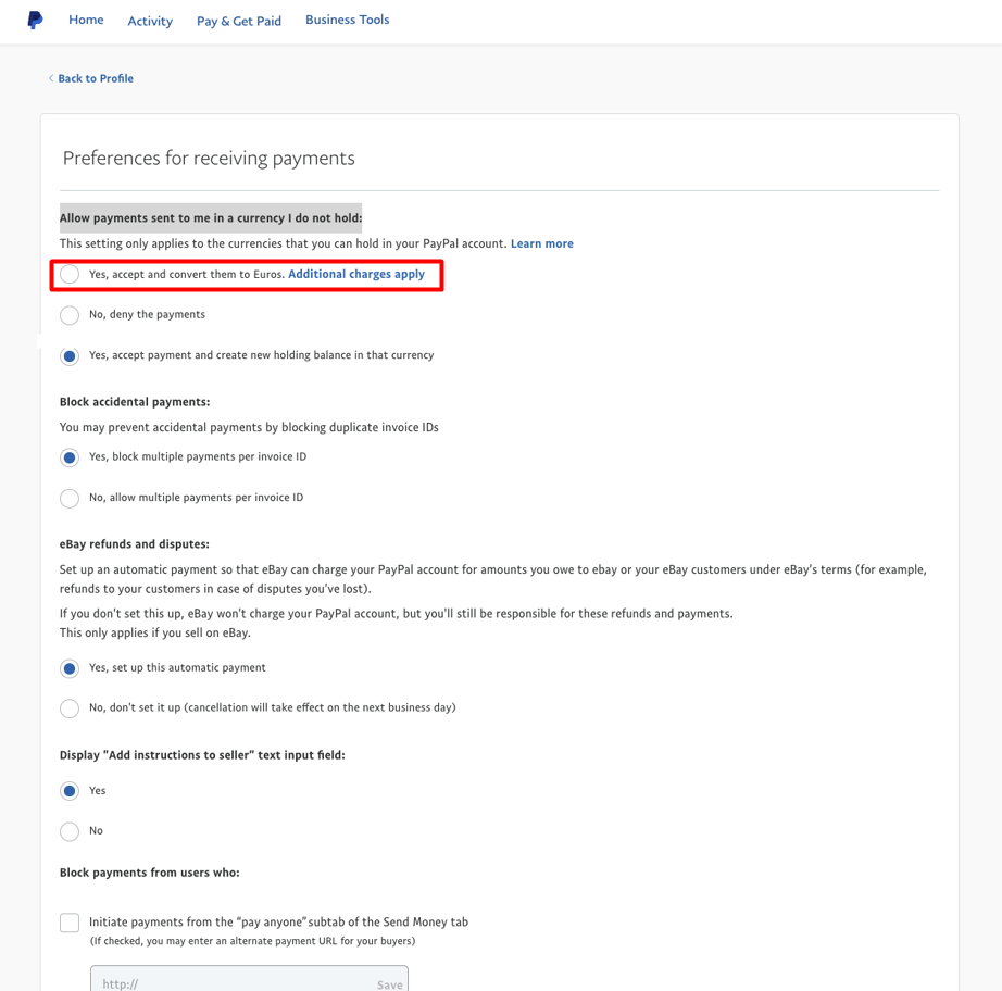 - At the top of the page, where it says, "Allow payments sent to me in a currency I do not hold:" you should check the first option, "Yes, accept and convert them to $/£/€" (whatever the default currency of your PayPal account is).