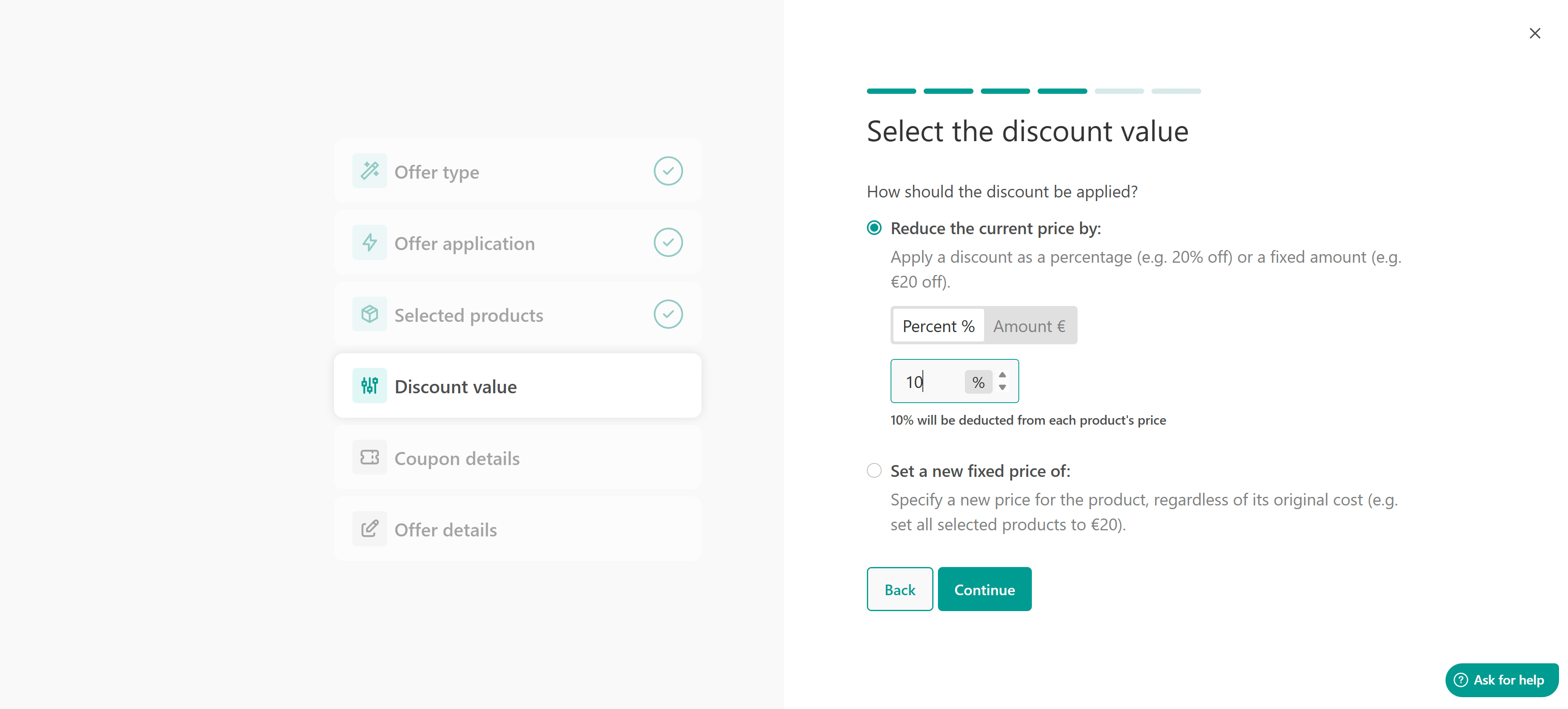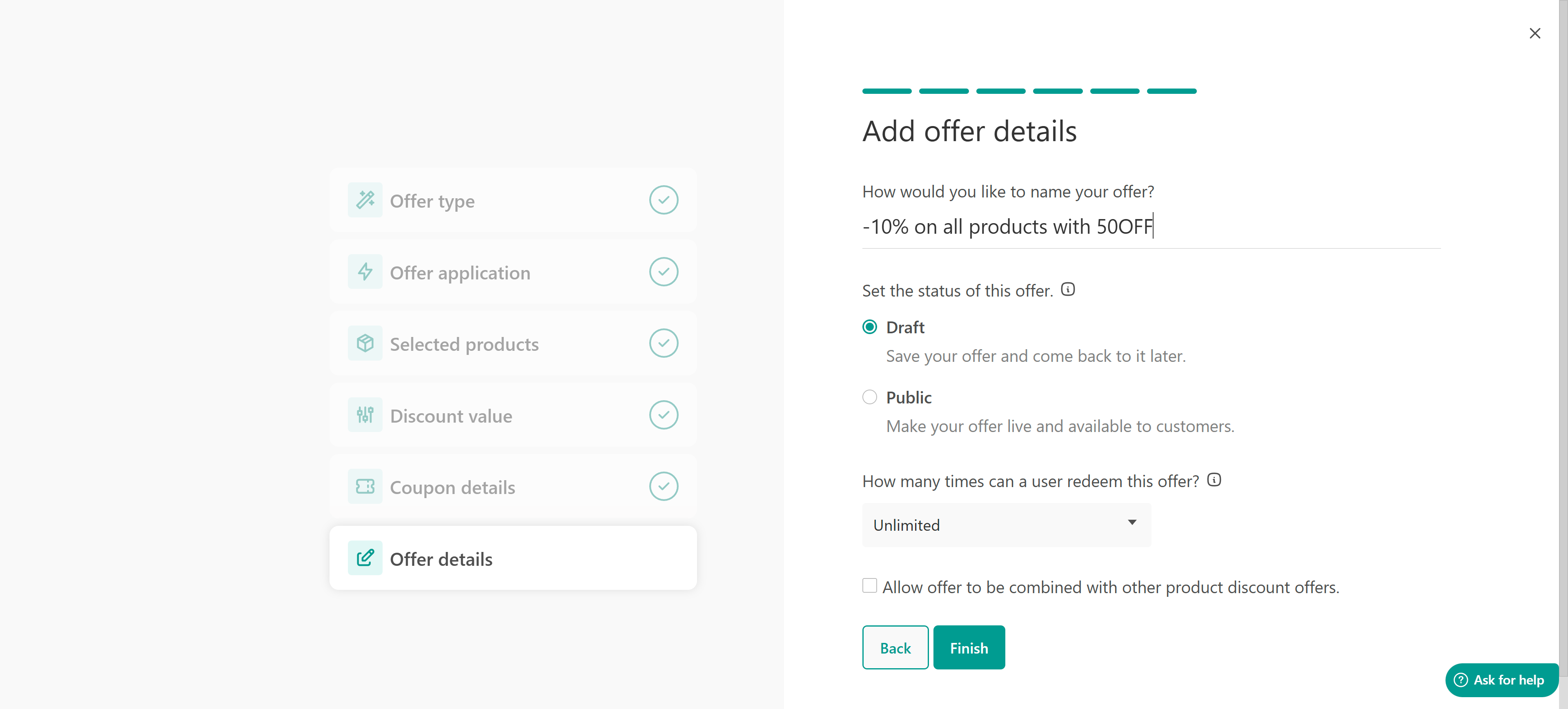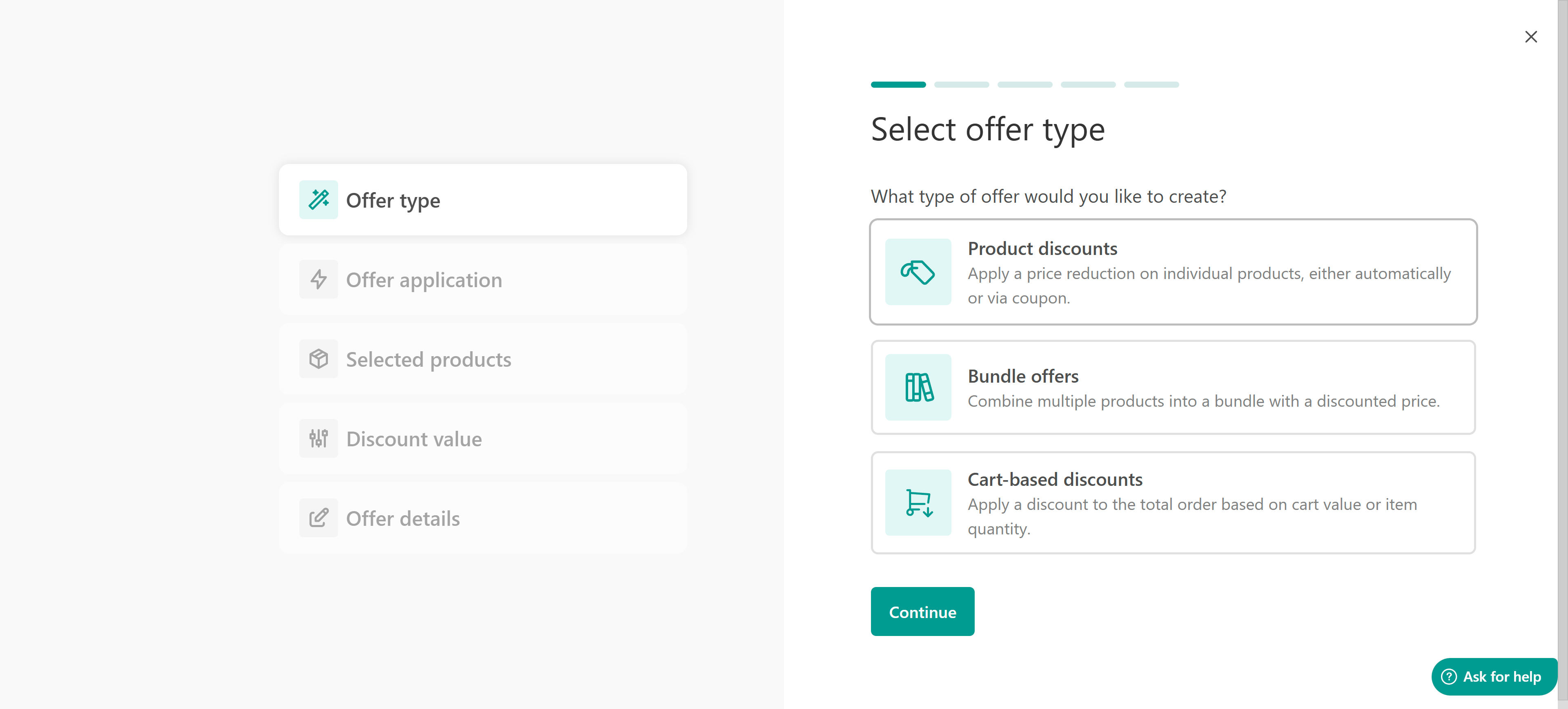You will be redirected to the Offers wizard, where you will see the steps you need to follow on the left.