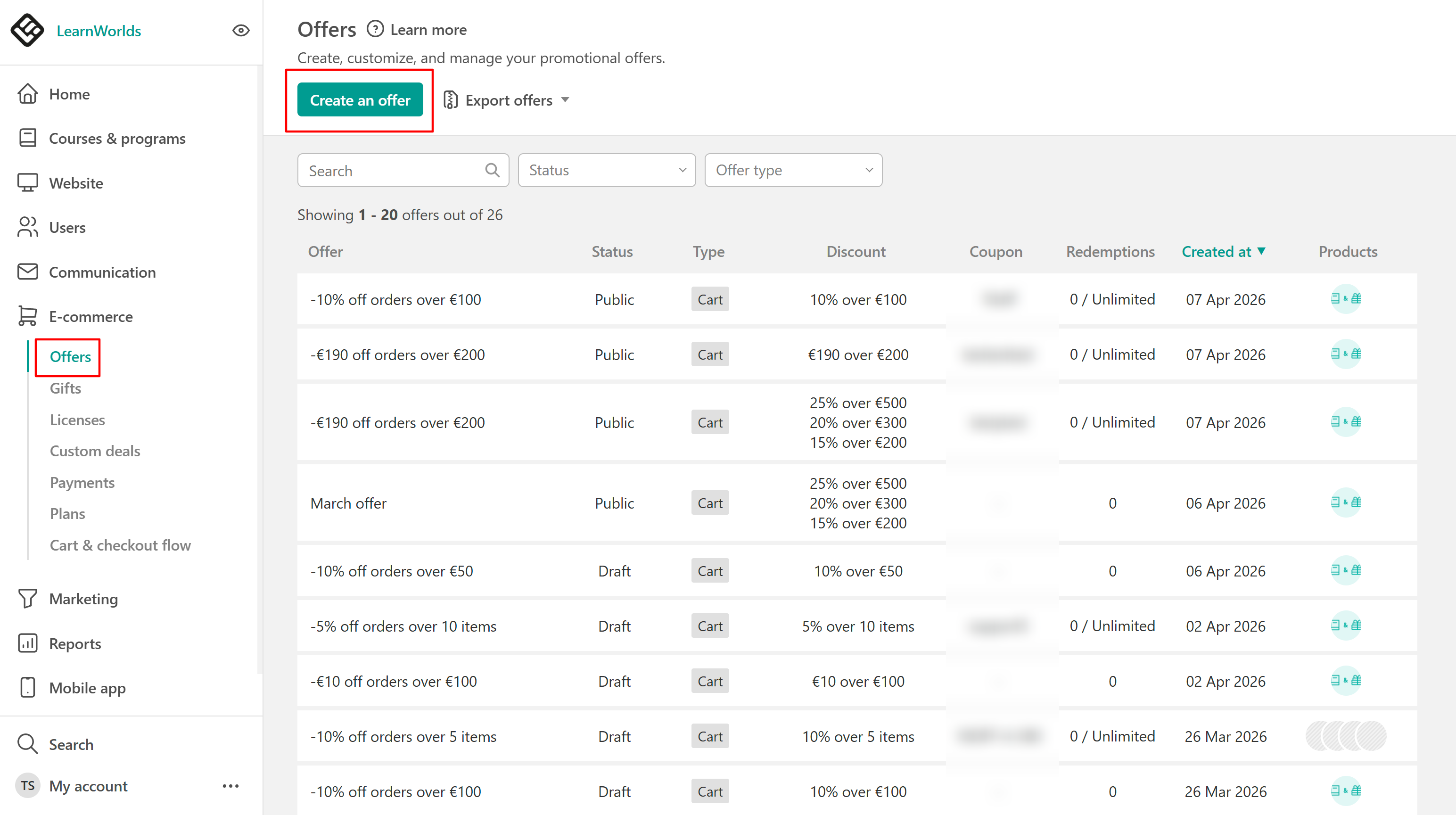 LearnWorlds gives you three types of offers to boost your sales and promotions: