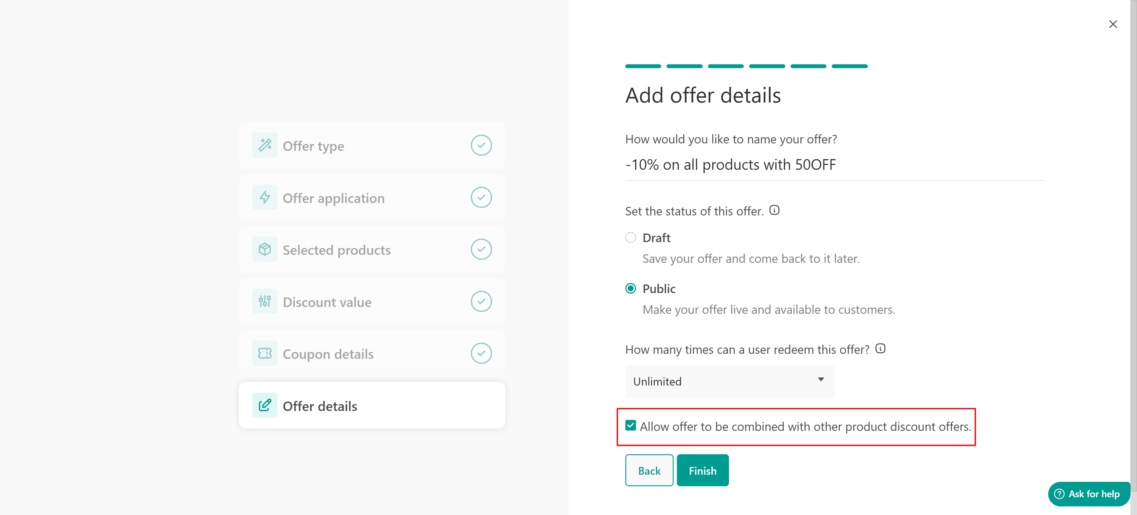 • Click on the checkbox to allow coupon(s) to be combined with other product discount offers.