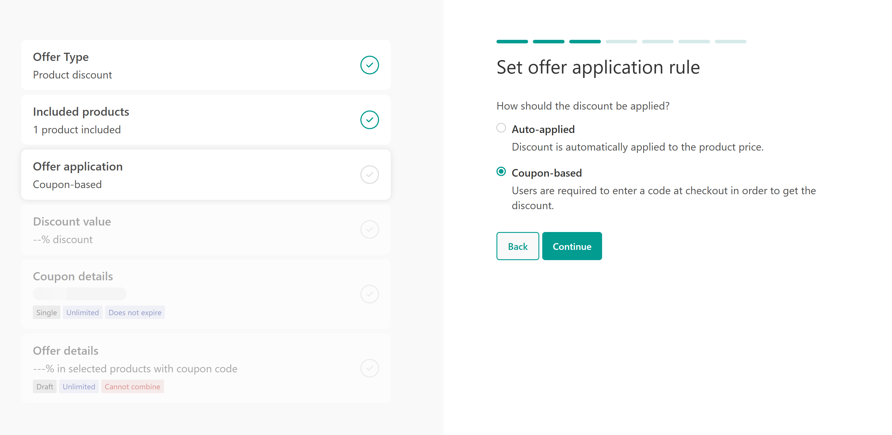 2. Configure the application of the offer by choosing the Coupon-based option. In this way, you can choose to apply the discount directly to the price of the product.