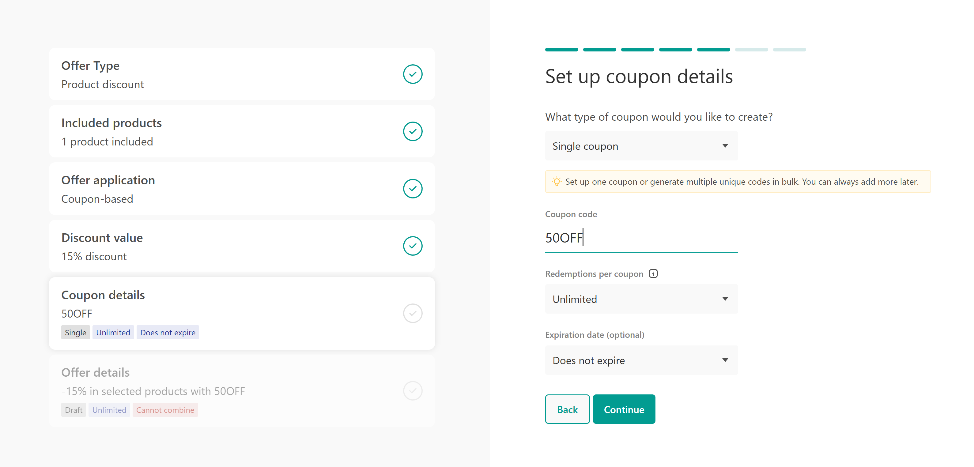 - Coupon-based offers allow customers to apply discount codes at checkout, including the ability to create bulk coupon codes for wider campaigns.