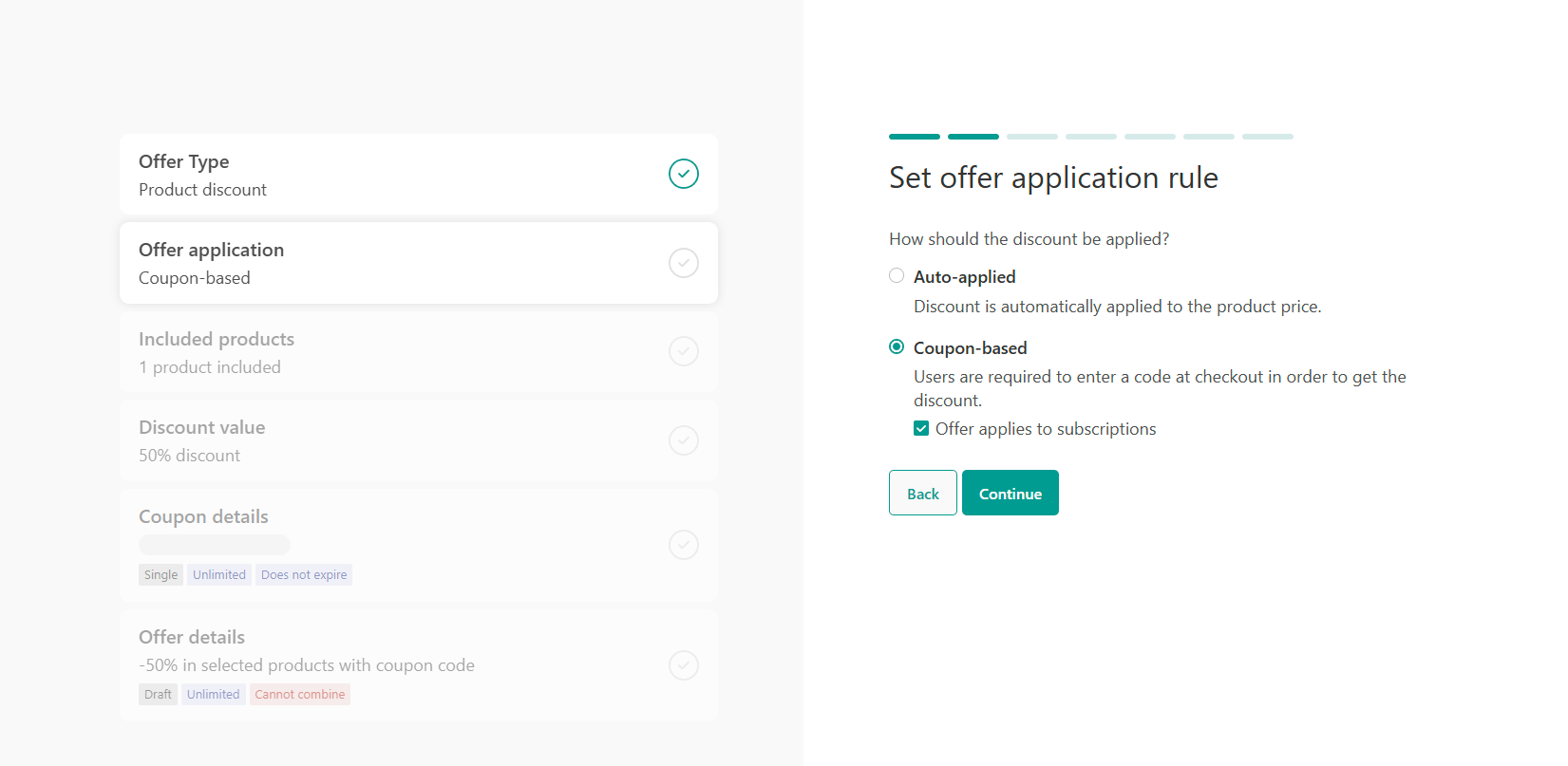2. Configure the application of the offer by choosing the Coupon-based option. In this way, you can choose to apply the discount directly to the price of the product.