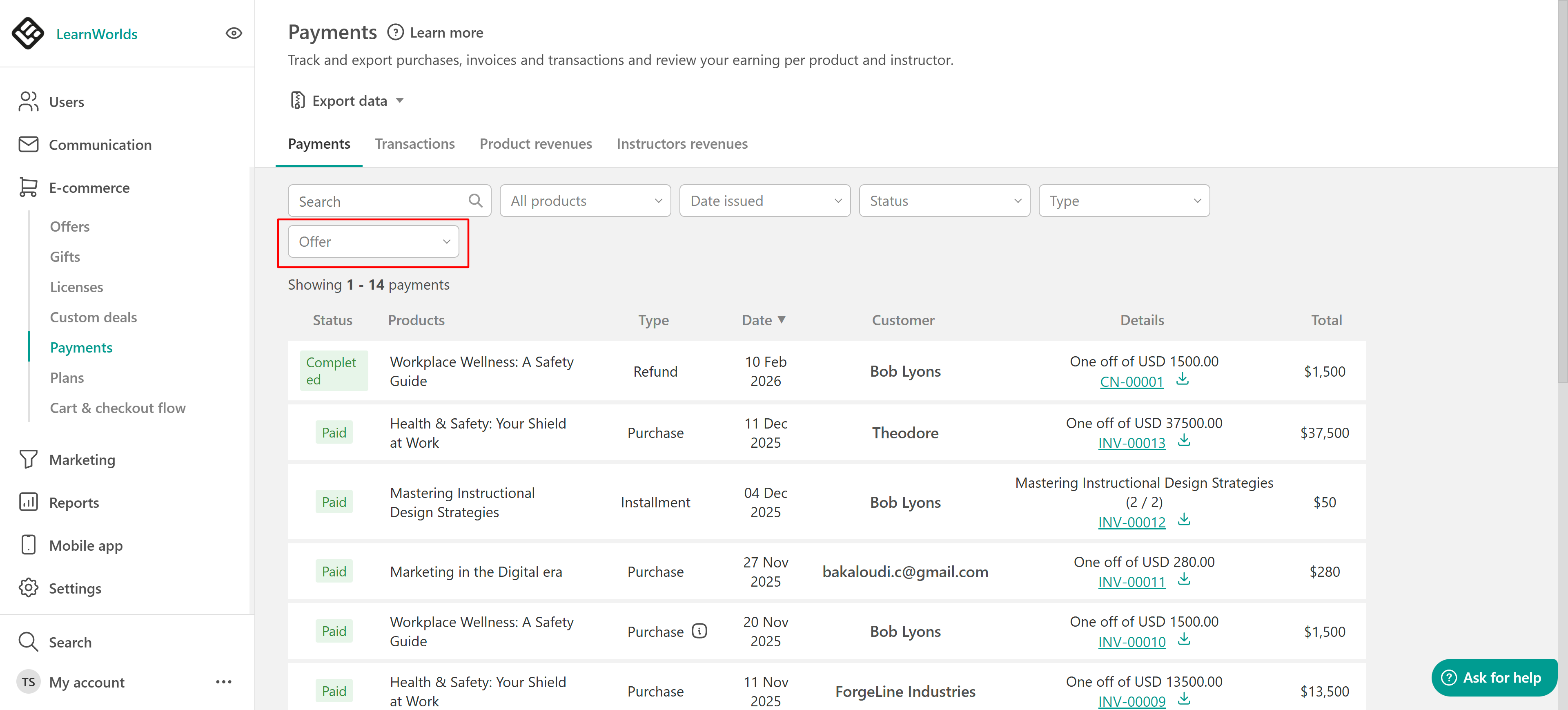 You can track how your bundle offer performs directly from the Payments page. Navigate to E-commerce → Payments and use the Offer filter to display all purchases where a specific bundle offer was applied.